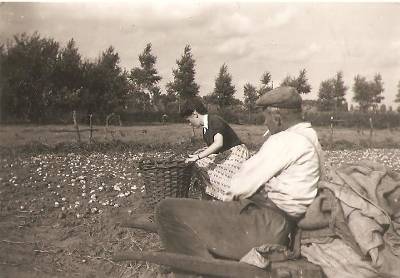 Op deze foto ziet u Hannes Pennings en zijn vrouw Gerarda, die woonden aan de Broekstraat in Gemonde, bezig met het rapen van aardappels. De foto dateert van rond 1925. Elk jaar werden er voor eigen gebruik aardappelen gepoot. De meeste mensen die een stukje land bij hun huis hadden, verbouwden toen ook nog zelf hun groenten. Aan de aardappels op het land en de stapel jute zakken op de kruiwagen is te zien, dat Hannes en Gerarda verwachtten behoorlijk wat kilo’s te oogsten!